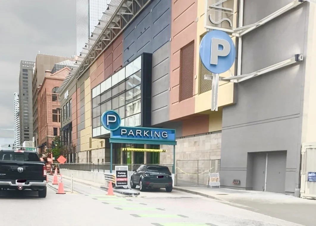 Drive into the underground parking all the way to the back. Pass the white pillars